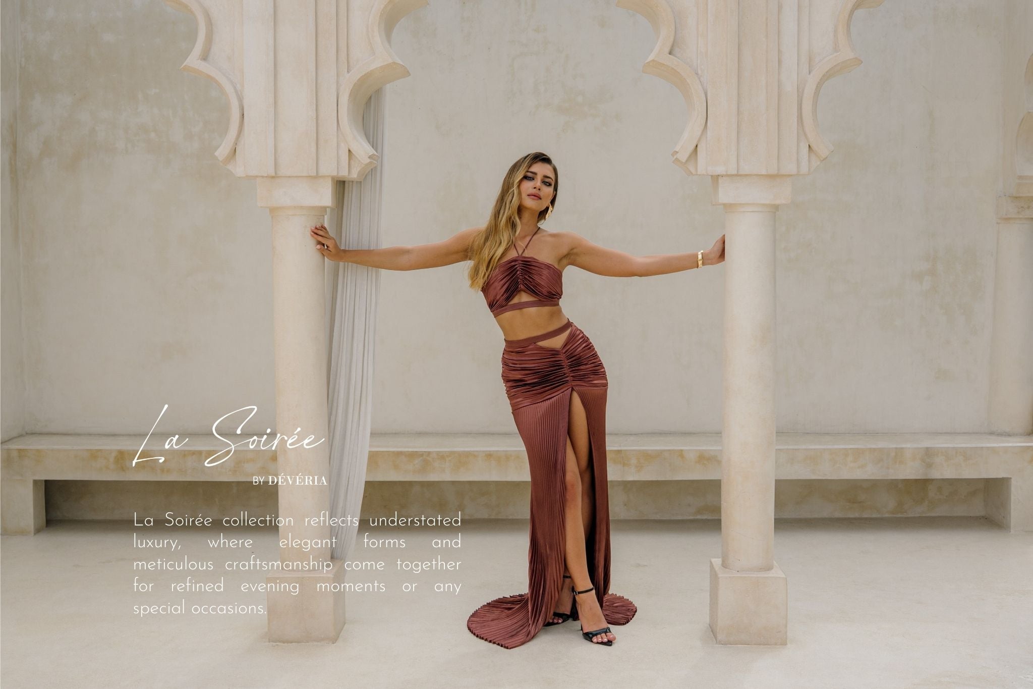 At DÉVÉRIA, we endlessly fascinated by the magic of fabrics . How they move , how they breathe , and how the empower . Through precise tailoring , sensual cut outs , and thoughtful design , we shape dresses that celebrate woman making them confident , alluring , and effortlessly elegant .